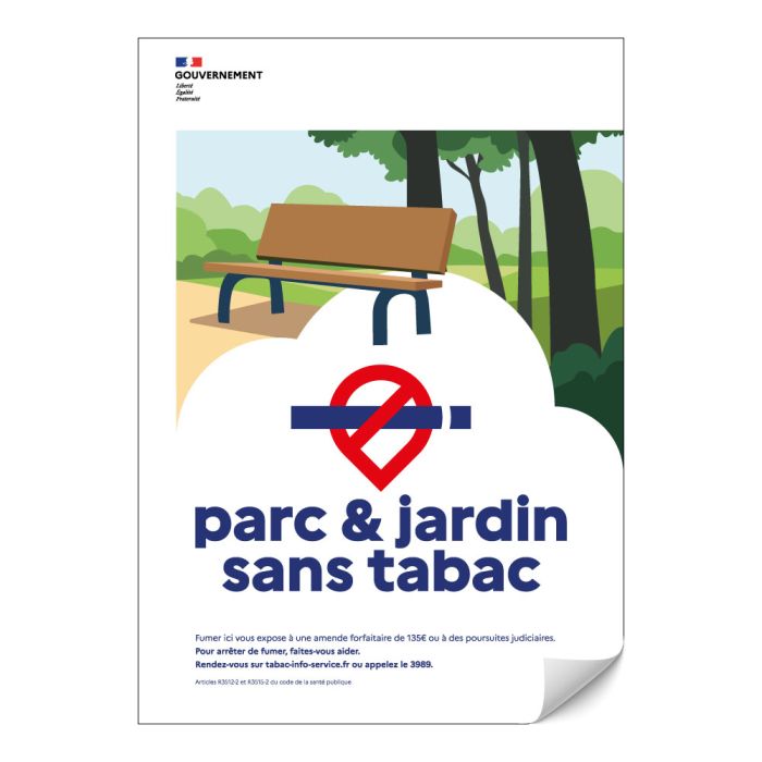 L'adhésif "Parc et jardin sans tabac" informe de la restriction concernant l'usage du tabac dans les espaces verts municipaux, suite à la législation entrée en application le 29 juin 2025. Cette mesure, destinée à préserver les enfants des effets nocifs de la fumée passive, s'ajoute aux dispositions de 2016 concernant l'interdiction de fumer dans les espaces de jeux, les zones boisées et forestières.