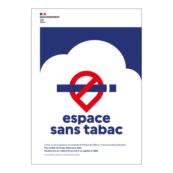 Le ministère du Travail, de la Santé, des Solidarités et des Familles a dévoilé une nouvelle signalisation officielle des « espaces sans tabac », conçue pour accompagner l’entrée en vigueur du décret dans le cadre du Programme national de lutte contre le tabac 2023-2027. Cette identité repose sur un monogramme explicite, combinant un pictogramme de géolocalisation et un symbole d’interdiction, dans une esthétique épurée. Elle est déclinée pour les lieux concernés. Novap vous les propose ainsi en différents formats, tous officiels, qui vous permettront d'afficher l'interdiction de manière claire et efficace.