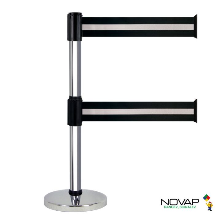 Tube en aluminium chromé sur socle en acier finition chromé équipé de patins anti-rayures. Deux têtes à sangle (dont une intermédiaire) pour un balisage multidirectionnel. Corps de la tête en ABS noir traité anti-UV.